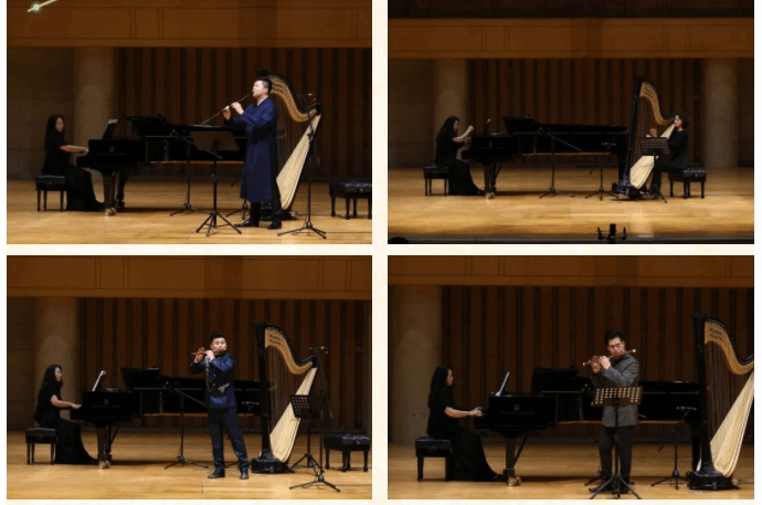 音乐会上,演奏家们通过箫与竖琴、笛与钢琴、笛与竖琴、竖琴与钢琴等多种形式的结合,精彩演绎了《相逢》《顶嘴》《山村迎亲人》《秋江夜泊》《啸月》《格拉纳达小夜曲》等作品。这些曲目涵盖了传统曲目与现代创作作品,从中国作品到西洋作品,为观众带来了一场跨越时空的绝美体验。