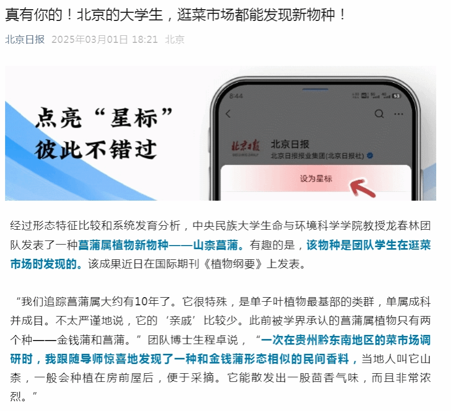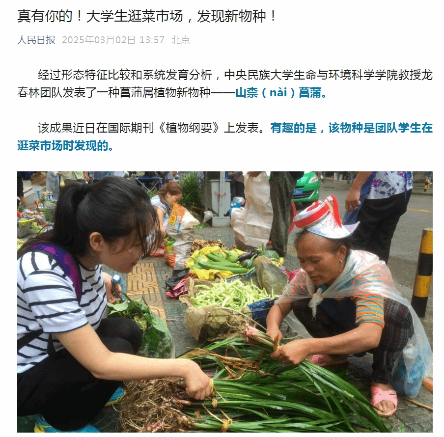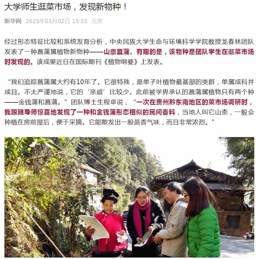 新闻网讯  近日,我校龙春林教授团队将在我国贵州省黔东南地区及其周边发现的“shan nai”确定为菖蒲属植物的新物种,并命名为山柰菖蒲。他们的这一研究成果发表在国际期刊《植物纲要》(PhytoKeys)上,并被《光明日报》报道。学校官微采访了团队师生如何找寻到这个“民间物种”,并惊奇地发现:他们逛菜市场逛出了新物种!文章一经发布,获得了人民日报、新华网、光明日报、北京日报的纷纷关注和转载报道。