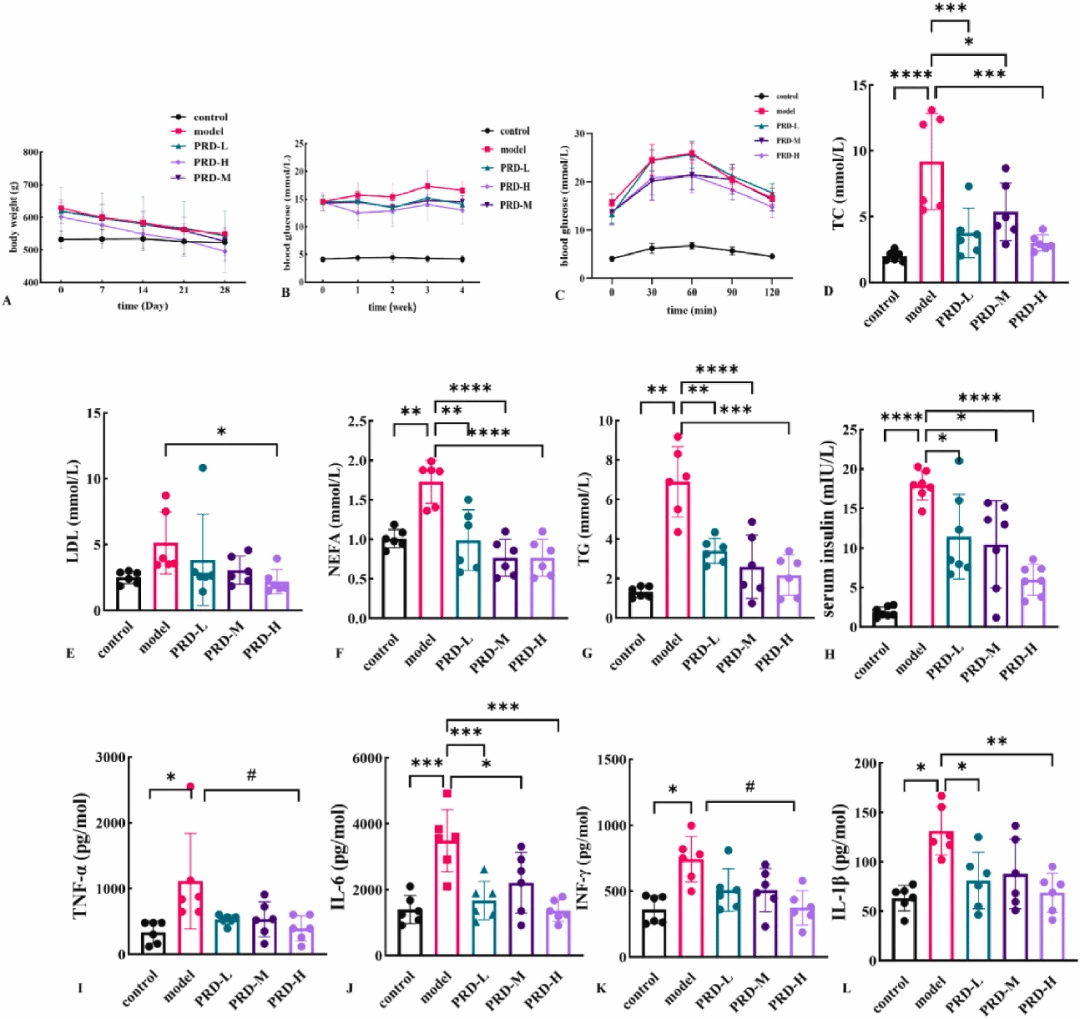 该团队在药理学专业期刊Journal of Ethnopharmacology上发表了题为“PuRenDan alleviates type 2 diabetes mellitus symptoms by modulating the gut microbiota and its metabolites”的最新成果。中药菩人丹(PRD)由苦瓜、人参、丹参、葛根和炙首乌五味药物组成。课题组前期研究表明,PRD可以降低大鼠的胰岛素抵抗和血糖水平,增强胰腺血流,改善胰岛β细胞结构与功能。然而,其治疗T2DM的主要机制尚不清楚。