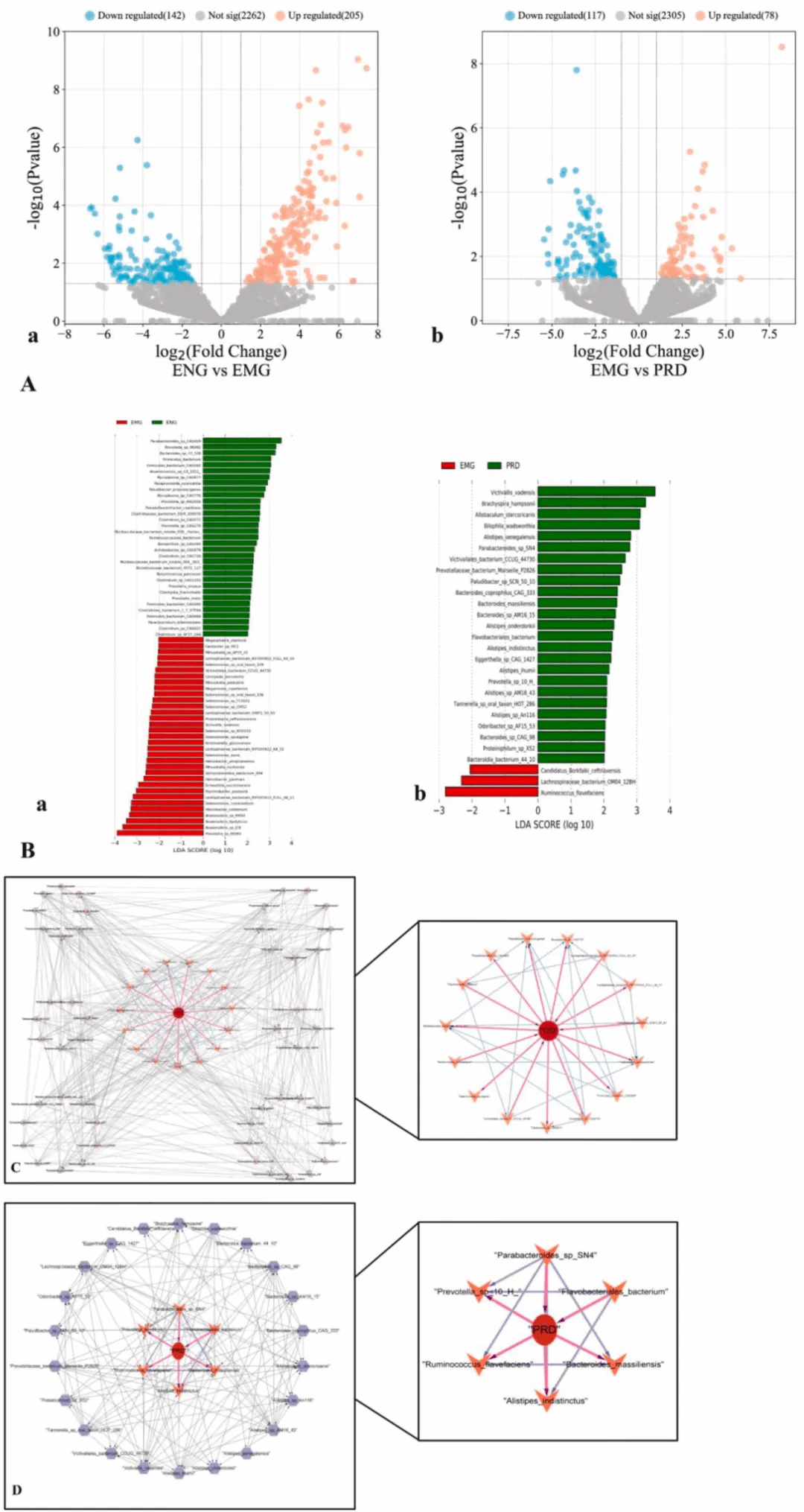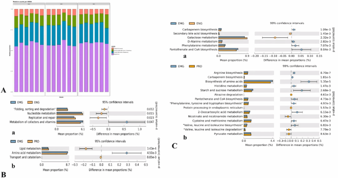 在本次研究中,研究者通过建立大鼠2型糖尿病模型,发现PRD治疗后大鼠血糖水平显著下降,同时有效改善了血脂异常、胰岛抵抗和炎症反应。通过宏基因组分析,研究者发现菩人丹显著改善了肠道微生物的丰度,改变了多种微生物的含量。进一步分析表明,与PRD治疗关系最密切的物种包括P.sp 10 (H)、Pa. sp SN4 等。KEGG分析显示,PRD组的脂肪代谢、转运和分解代谢显著富集,而糖尿病组富集氨基酸代谢。此外,采用基于UHPLC - QTOF/MS的非靶向代谢组学方法,研究者发现PRD降低了包括苯甲酸、胆酸等在内的29种代谢产物的水平。