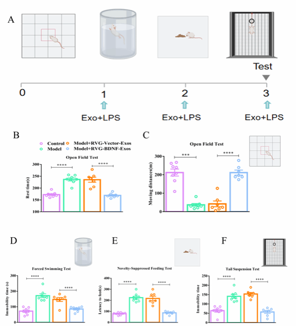 在一系列行为学测试中,接受RVG-BDNF-Exos治疗的小鼠表现出显著的抑郁症状改善。例如,在旷场测试中,小鼠的静止时间显著减少;在强迫游泳测试和尾悬测试中,小鼠的静止时间也显著缩短;在新奇食物抑制测试中,小鼠在新环境中的进食潜伏期明显缩短。这些结果表明RVG-BDNF-Exos能够显著改善抑郁样行为(图3)。