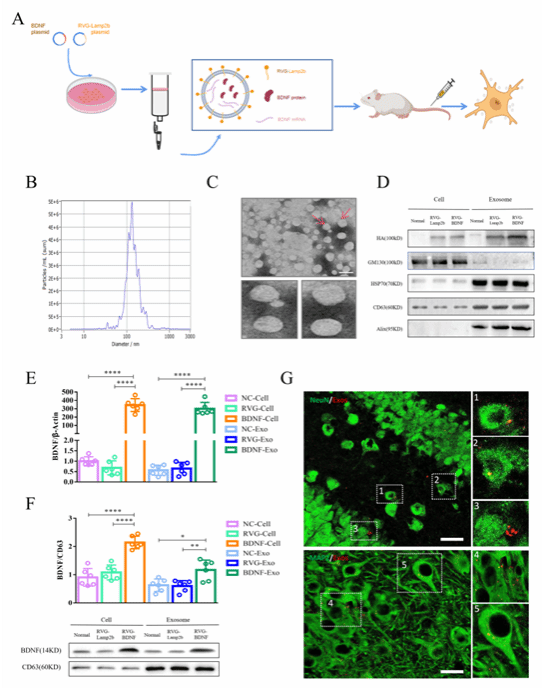 程勇教授课题组通过基因工程技术开发出一种能够高效递送BDNF基因的靶向外泌体。具体来说,他们将神经元特异性的狂犬病毒糖蛋白(RVG)和BDNF基因结合,并导入到293T细胞中。这些细胞随后生产出含有BDNF基因的工程化外泌体(RVG-BDNF-Exos),能够特异性地靶向神经元。